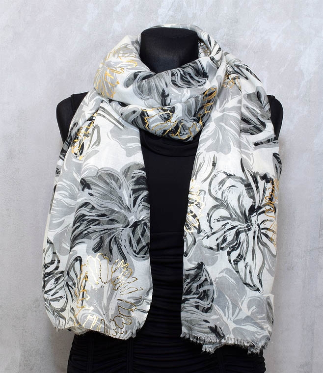 Szal w kwiaty z delikatnym złoceniem – lekki i kobiecy akcent na jesień.