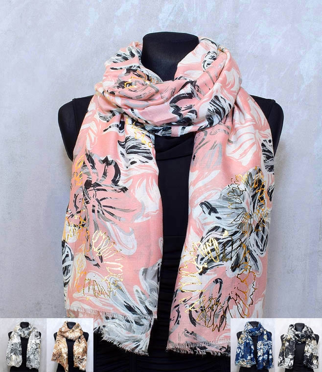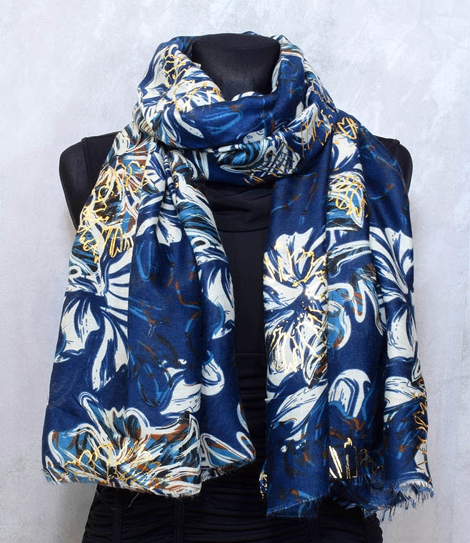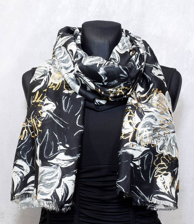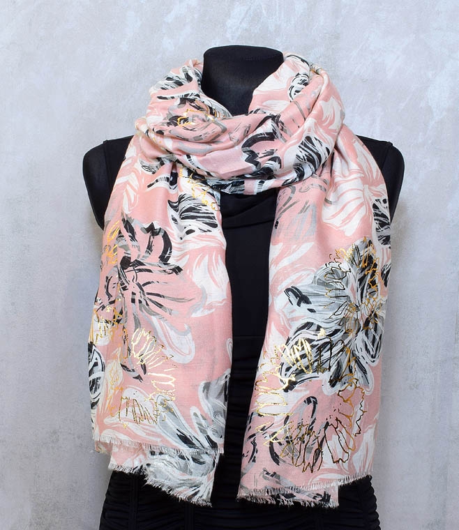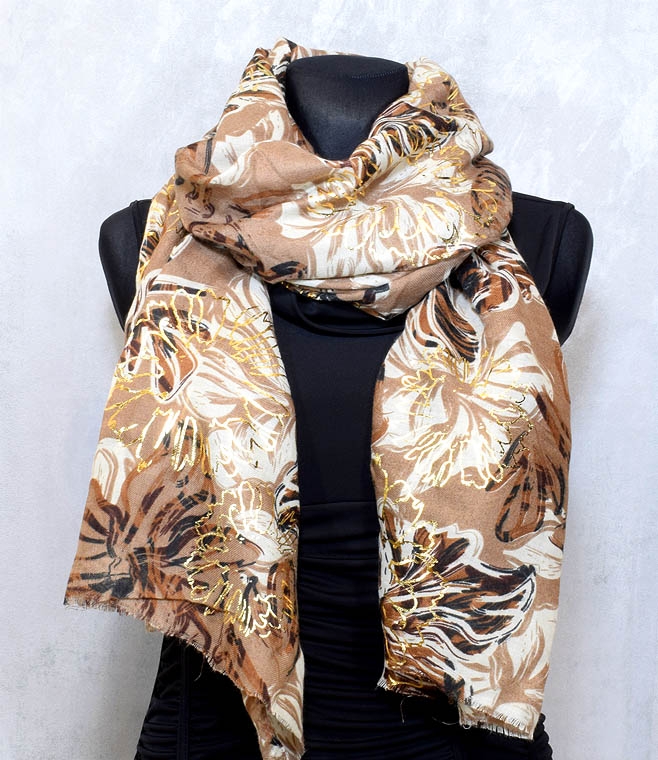 Śliczny, cieńszy szal wykonany w 100% z miękkiej wiskozy. Zachwyca kwiatowym wzorem w jesiennej kolorystyce oraz subtelnym, złotym akcentem, który dodaje mu elegancji. Przyjemny w dotyku i pięknie się układa – doskonale sprawdzi się jako dodatek do płaszcza, swetra czy lekkiej kurtki.